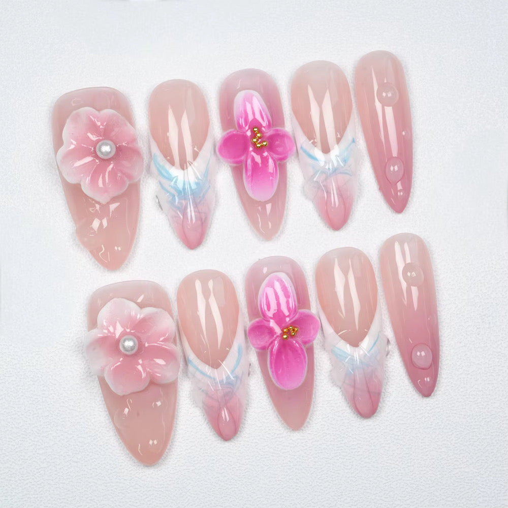 * The design includes *3D flowers* with pearl accents, *blue and white plaid*, and *water droplet* effects.